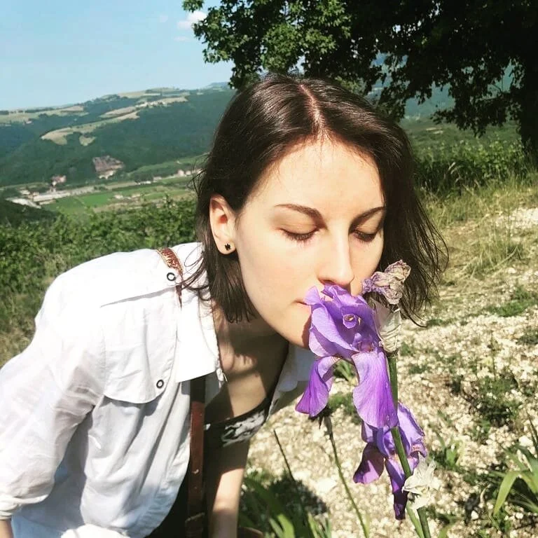 In questa foto ci sono io che affondo il naso sull’unico iris rimasto nel campo che ho cercato in lungo e in largo in una calda estate di giugno: